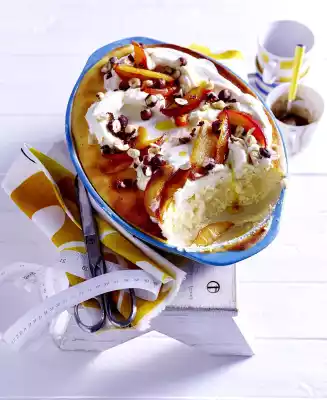 For the topping, wash and quarter the apples, remove the core and cut the apples into slices. Heat clarified butter in a pan. Fry the apple slices for about 1 minute while turning. Sprinkle with sugar and lightly caramelise while turning for about 1 minute.