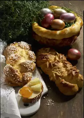 Cut into 12 pieces and roll 12 strands of 15 cm long and 2 cm Ø. Braid 3 strands to a plait and press the ends together. For the basket, form 10 small strands of 2 cm long and 1 cm Ø and 2 strands of 20 cm long and 1 cm Ø from the remaining dough. Weave the 10 strands into a lattice and place them over a small ovenproof dish (e.g. cup), pressing the ends together slightly. Turn the 2 strands into a cord, close it to form a ring and place everything on a baking tray. Let the dough rise for another 20 minutes. Stir the egg yolk and 1 teaspoon of water until smooth and brush everything with it. Sprinkle two plaits with almond slivers and two with sugar crystals. Bake in the preheated oven (electric cooker: 200 °C/ gas: level 3) for 25-30 minutes. Remove and let cool. Remove the basket from the pan, turn it over and place the ring on top.