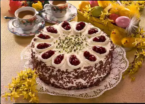 Separate eggs. Beat the egg whites, 5 tablespoons of lukewarm water and salt until stiff. Add 125 g sugar and 1 packet of vanilla sugar and continue beating. Stir in the egg yolks briefly. Mix flour, 100 g starch, cocoa and baking powder, sieve onto the egg mixture and fold in carefully. Line the bottom of a springform pan (26 cm Ø) with baking paper. Spread the dough in the form and bake in a preheated oven (electric: 175°C/ gas: level 2) for about 35 minutes. Let the base cool down. Then cut through twice, place the bottom cake layer on a plate and place the edge of the springform pan on top. Drain the cherries and collect the juice. Stir the rest of the starch and 4 tablespoons of juice until smooth. Boil up the rest of the juice, 2 tablespoons of sugar and the cinnamon stick. Stir in the starch and bring to the boil again briefly. Remove the cinnamon stick, fold in 2/3 of the cherries and spread the compote on the lower cake base. Allow to set. Soak the gelatine. Whip 1 1/2 cup of cream, 2 tablespoons of sugar and remaining vanilla sugar until stiff. Squeeze the gelatine and dissolve. Stir the kirschwasser into the stiff cream. Spread half of the kirschwasser cream on the compote. Place 2nd base on top, spread remaining stiff cream on top and cover with the last base. Put the cake in a cool place for about 1/2 hour. Whip remaining cream and sugar until stiff. Spread 2/3 of the cream on the cake. Spray the remaining cream onto the cake with a piping bag with a perforated spout in about 12 egg-shaped circles. Sprinkle the grated chocolate on the edge of the cake and the pistachios in the middle. Mix the remaining cherries and cherry sauce and spread into the sprinkled eggs. Results in about 16 pieces