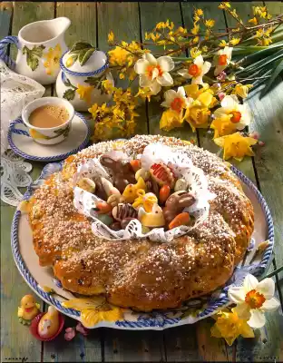 Place on a baking tray lined with baking paper. Bake in the preheated oven (electric cooker: 175 °C/ convection oven: 150 °C/ gas: level 2) for 50-60 minutes, remove from oven. Heat up the apricot jam, pass through a sieve and after about 10 minutes spread on the warm wreath.