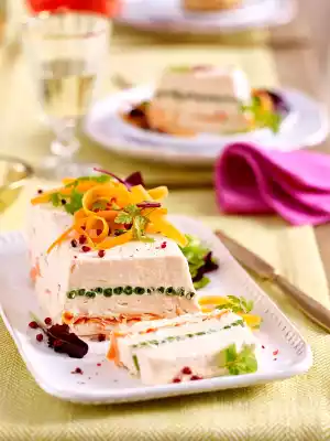 Rinse a box mould (approx. 24 x 10 x 6 cm; approx. 1 l capacity) with water and cover with foil. Smooth out approx. 1/3 of the salmon cream in the mould. Spread the beans close together. Spread 1/2 salmon cream on top of the beans. Spread blanched carrot strips on top. Spread the rest of the salmon cream on top. Cover and put in a cool place overnight.