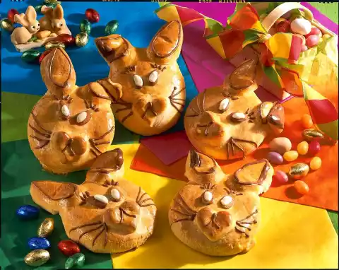 Mix the egg yolk and cream and coat the bunnies with it. Bake in the preheated oven on the 2nd rack from below (electric oven: 175 °C/ gas: level 2) for 15-20 minutes. Let the bunnies cool down.