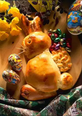 Form a head, 2 paws and 2 ears each. Put the individual pieces together on a floured baking tray to form an Easter bunny. Decorate with almonds. Leave to rise again for another 15 minutes. Brush with whisked egg yolk.
