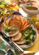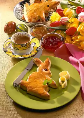 Place the template on top and cut out the rabbit with a sharp knife. Place 3 rabbits each on a baking tray lined with baking paper. Whisk egg yolk and cream. Spread the rabbits with the egg cream, decorate with the raisins and bake in the preheated oven (electric cooker: 200°C/ gas: level 3) for 15-20 minutes.