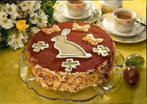 Put marzipan figures on the cake. Sprinkle butterflies with sugar sprinkles. Mix the remaining icing sugar with a teaspoon of water to a glaze. Pour into a freezer bag, cut off a small corner of it and trace the contours of the rabbit and the clover leaves.