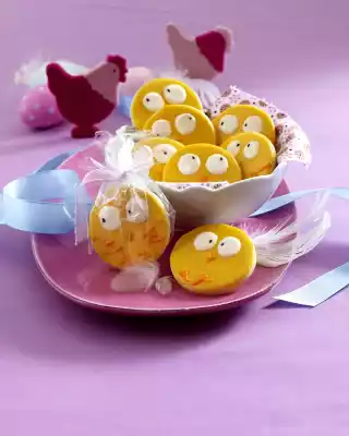 First spread the biscuits evenly with the yellow icing. Fill the orange icing into the piping bag, cut off a small corner and draw beak and feet. Draw the eyes with the white icing and use linseed for the pupils. Let cookies dry