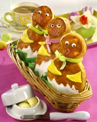 Roll the bodies into a slightly oval shape. Whisk the egg. Brush body and heads with some egg, put together and press on a little. Put the chicks on 2 baking trays lined with baking paper. Brush the chick with the rest of the whisked egg. Bake in a preheated oven (electric cooker: 200 °C/ convection oven: 175 °C/ gas: level 3) for 12-15 minutes. Let them cool down. Mix icing sugar, egg white and 1-2 tablespoons of water with the whisk of the hand mixer to a smooth glaze. Approx. 3 tablespoons of icing with yellow food colouring, approx. 1 tablespoon with red food colouring. Pour the mixture into three disposable piping bags and paint the chicks with it.