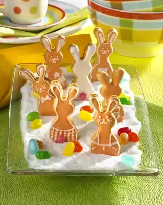 Cut out rabbits (8 cm high) and place them on 3 baking trays lined with baking paper. Roll out the rest of the dough again. Cut out further rabbits. Bake the trays one after the other in a preheated oven (electric range: 175 °C/ convection oven: 150 °C/ gas: level 2) for about 15 minutes. Let the biscuits cool down. Mix egg white, icing sugar and lemon juice with the whisk of the hand mixer. Leave 1/4 of the icing white. Colour the rest of the icing orange with red and yellow food colouring. Put the white icing in a small piping bag or freezer bag. Cut off a small corner. Spread the biscuits with orange icing.