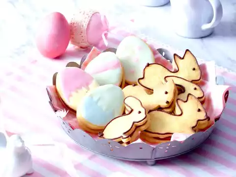 Chop 25 g chocolate and melt over a warm water bath. Sift 100 g icing sugar and mix with 2 tablespoons of water, divide into 4 portions and colour differently with food colouring. Pour the chocolate and icing into piping bags with small perforated spout. Decorate rabbit cookies with chocolate. Decorate egg biscuits with icing. Leave the biscuits to dry in a cool place for at least 2 hours. Store in a cool and dry place and consume promptly