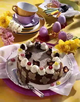 Fill in sponge cake mixture and smooth it down. Bake in the preheated oven (electric cooker: 175 °C/ convection oven: not suitable/ gas: level 2) for 20-25 minutes. Let them cool down. Cut the cake base into egg shape. Finely crumble the remaining dough. Cut the egg once. Whip the chocolate cream with the whisk of the hand mixer until stiff. Halve the mixture. Stir the dough crumbs into one half. Spread the bottom half of the egg with this cream. Place the second half of the egg on top. Spread the rest of the cream all around. Chill the cake for about 1 hour. In the meantime knead marzipan and icing sugar. Roll out thin foil between 2 layers.