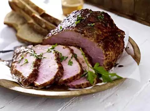 Coat the roast with half of the glaze. Roast in the preheated oven (electric cooker: 175 °C/ convection oven: 150 °C/ gas: level 2) for approx. 30 minutes. After half the roasting time, spread the remaining glaze over the roast
