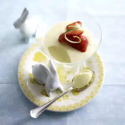 Stir in 3-4 tablespoons of lime egg cream, then stir into the remaining cream. Put it in a cold place. As soon as the cream starts to gel, beat the egg whites until stiff and fold in. Pour cream into glasses and refrigerate for about 2 hours. Wash, clean and halve the strawberries and put them into a bowl. Decorate lime cream with strawberries and lime strips just before serving