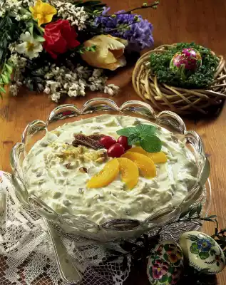 Coarsely chop nuts, almonds, figs and dates. Drain the fruit cocktail. Beat the fat until foamy, gradually adding egg yolk and sugar. Stir in quark. Put aside some fruit cocktail and chopped ingredients for decorating as desired. Stir the remaining fruit, chopped ingredients, vanilla pulp and raisins into the quark mixture. Place the Easter pasha in a bowl and serve with the ingredients set aside and decorated with peppermint leaves as desired