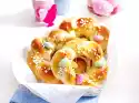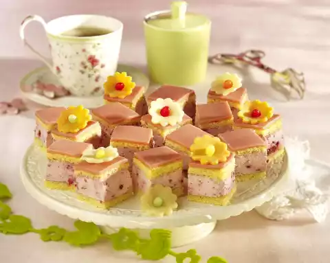 Colour 1 part marzipan yellow-orange, leave the other part "natural". Roll out the yellow-orange and undyed marzipan on a work surface and cut out small flowers (approx. 10 pieces). Place small jelly eggs in the middle of the flowers. Roll out pink marzipan rectangularly (approx. 32 x 20 cm). Remove the cake from the cake frame. Heat up the jam and spread it on the surface of the sponge cake. Place the marzipan plate on top, cut approx. 24 pieces (3 x 3 cm) and decorate with flowers (stick the flowers with some jam)