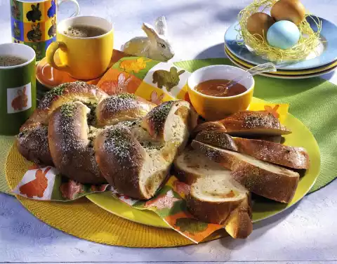 Separate the egg. Whisk the egg white. Brush the free edges with it. Roll up the strips from the long side. Loosely weave the dough rolls and lay them diagonally on a baking tray lined with baking paper. Cover the plait and let it rise again for about 20 minutes. Bake in the preheated oven (electric cooker: 200 °C/ convection oven: 175 °C/ gas: level 3) for approx. 30 minutes. Mix cream and egg yolk and brush the plait with it about 10 minutes before the end of the baking time. After the end of the baking time, let the plait rest in the switched off oven for approx. 5 minutes. Remove from the oven and let it cool down. Chop the pistachios finer. Warm up the apricot jam and brush the plait with it. Sprinkle with pistachios. Dust with icing sugar as desired