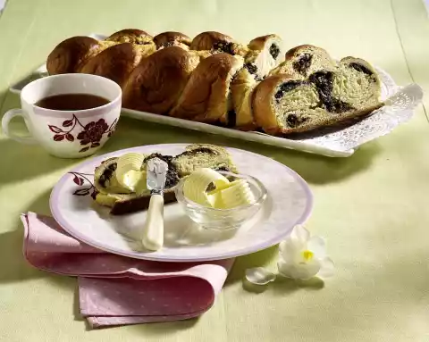 Put the poppy seed mixture into a piping bag with a perforated spout and squirt 1 strand of poppy seed mixture onto the bottom long side of each rectangle. Brush the edges with egg yolk milk and roll up from the lower long side. Weave the strands into a braid and place on a baking tray lined with baking paper. Press the ends together firmly. Brush the plait with egg yolk milk and bake in a preheated oven (electric cooker: 200 °C/ convection oven: 175 °C/ gas mark 3) for approx. 30 minutes. Let it cool down or let it cool down. Serve lukewarm or cold with butter