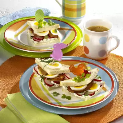 Remove the crusts from bread if necessary. Cut the toast slices diagonally into quarters. Spread 8 corners with herb cream, except for some. Cover with radishes, egg and steaks. Put the remaining toast slices on top as a lid. Garnish with remaining herb cream, egg and radish.