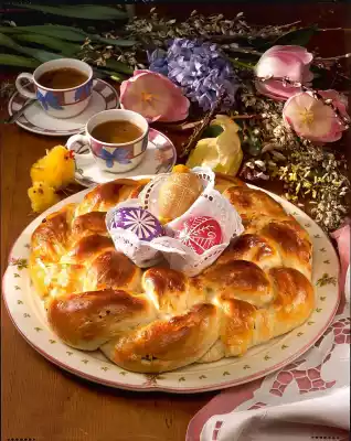 Braid the strands into a plait and lay them on a greased baking tray to form a wreath. Let it go again for about 15 minutes. Whisk the egg yolk and cream, brush the plait with it and bake in a preheated oven (electric range: 200 °C/ gas: level 3) for 35-40 minutes.