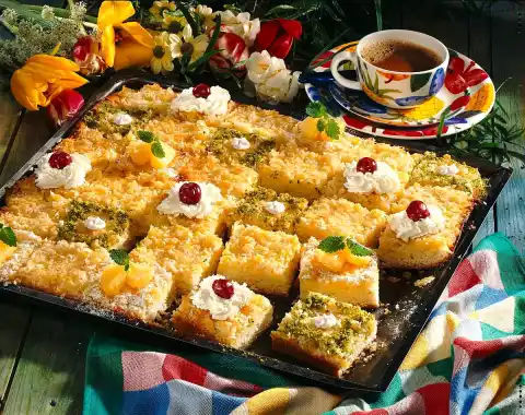 In the meantime, melt the remaining fat in a pot. Add the grated coconut and pineapple and the remaining milk and sugar and mix. Roll out the yeast dough on a greased baking tray and let it rise for another 15 minutes, spread the icing on top and bake in a preheated oven (200 ° C/ gas: level 3) for 20-25 minutes. Cut the cake into pieces, decorate with cream tuffs, ground pistachios, cherries, pineapple pieces, lemon balm, sugar flowers. Results in about 30 pieces