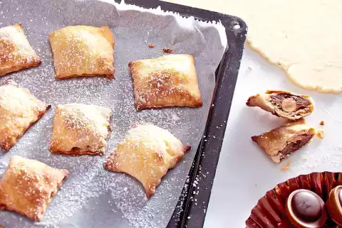 Preheat oven (electric cooker: 200 °C/circulating air: 180 °C/gas: see manufacturer). Cut dough into thirds. Roll out a third (the rest back to cold) on a little flour 2-3 mm thin. Divide into rectangles (approx. 4 x 8 cm each) with a dough wheel. Place 1 praline on each half of the rectangle. Brush the dough very thinly with water. Fold the other half of the dough rectangle over the praline and press down all around the edge. Roll out the rest of the cold dough in the same way and fill.