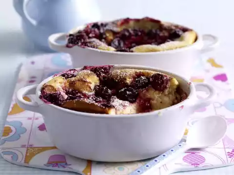 Pour the curd mixture into the moulds or large mould. Spread the cherries evenly on top. Bake in a hot oven for 45-50 minutes until golden brown. If necessary, cover with aluminium foil after 30 minutes, otherwise your quark casserole will become too brown.
