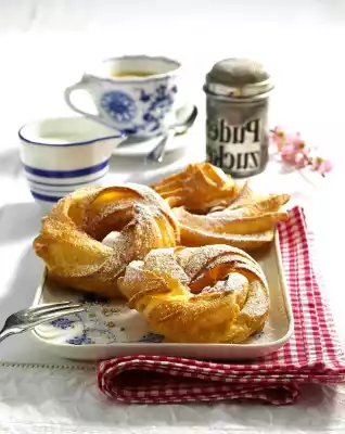 Pour the dough into a piping bag with a large star-shaped spout. Spray approx. 12 circles (each approx. 8 cm Ø) onto the baking paper. Slide 3-4 cakes each into the grease, holding the paper firmly until the dough has dissolved. Bake the spatter cakes for 2-3 minutes on each side. Lift them out and drain them on kitchen paper. Dust with icing sugar