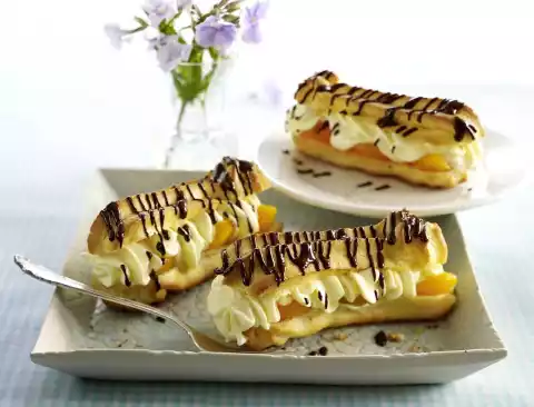 Bake the eclairs in a preheated oven (electric cooker: 200 °C/ convection oven: 175 °C/ gas: level 3) for approx. 25 minutes. Take the finished eclaisr out of the oven and let them cool down. Put the apricots in a sieve and let them drain. Puree 3 apricot halves and lemon juice. Stir mascarpone, quark, puree, sugar and vanilla sugar until smooth. Whip the cream until stiff, pour in the cream firming agent and fold into the cream. Pour cream into a piping bag with a large star-shaped spout. Cut the apricot halves into three. Before serving, roughly chop the chocolate and melt in a bowl over a warm water bath. Cut the eclairs in half horizontally.