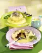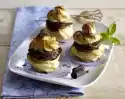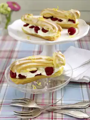 Then stir into the remaining mixture. Chill for about 25 minutes until the mixture has a creamy consistency. Sort the raspberries, possibly halve them. Whip the cream until stiff and fold into the yoghurt mixture with the raspberries. Fill the eclairs with the lemon yoghurt cream and serve. Decorate with lemon zests