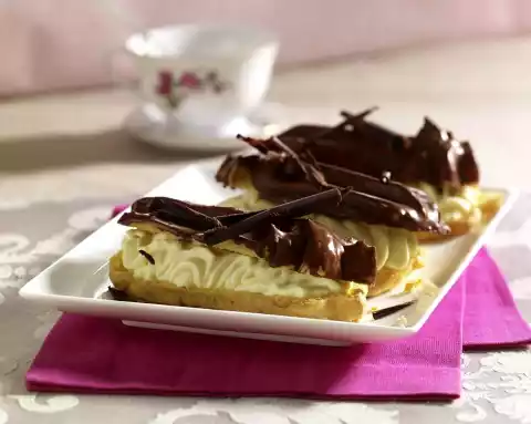 Finally stir in baking powder. Pour the dough into a piping bag with star-shaped spout. Spray about 8 strips onto a baking tray lined with baking paper. Bake in the preheated oven (electric range: 225 °C/ convection oven: 200 °C/ gas: level 4) on the middle shelf for approx. 30 minutes. Remove, let cool and cut through with scissors while still warm. Let cool off. Melt the chocolate coating over a warm water bath. Coat the eclair lid with chocolate coating and let it dry. Drain the mango. Soak gelatine in cold water. Puree the mango.