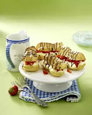 Put the dough into a piping bag with a large star-shaped spout and squirt 12 éclairs (8-9 cm long) onto a baking tray lined with baking paper. Bake in the preheated oven (electric cooker: 200 °C/ convection oven: 175 °C/ gas: level 3) for approx. 25 minutes. (The choux pastry rises better if you put a bowl of water on the bottom of the oven). Do not open the door in between, otherwise the pastry will collapse