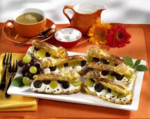 Put into a piping bag with a large star-shaped spout. Line 2 baking trays with baking paper and spray twelve strips of approx. 13 cm long onto them. Bake in a preheated oven (electric cooker: 225 °C/ convection oven: 200 °C/ gas: level 4) for approx. 25 minutes. Cut open the finished eclairs while still hot with scissors and let them cool down. Soak the gelatine in cold water. Cut the grapes in half and possibly remove the seeds. Stir the sour cream, icing sugar and vanillin sugar until smooth. Squeeze the gelatine, dissolve and mix with 5 tablespoons of sour cream. Stir into the remaining cream. Fold in chocolate flakes and chill the cream. In the meantime, whip the cream until stiff.