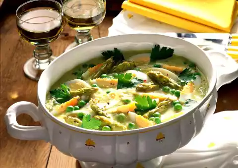 Cut the remaining asparagus into pieces. Add the asparagus, potatoes, carrots and half of the peas to the boiling broth and cook covered for 15 minutes. In the meantime, add eggs to the boiling water and cook for 10 minutes until hard.
