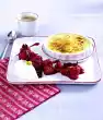 Set aside some diced shallots, cucumber and parsley for sprinkling. Halve the eggs, take out the egg yolks, puree with the quark and yoghurt. Dice the egg white. Fold in egg white, parsley, cucumber and shallots.