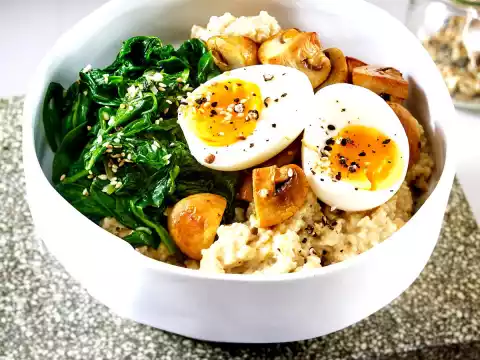 Fry the rest of the onions in 1 tablespoon butter. Steam oat flakes briefly. Add 600 ml water and stock, bring to the boil, then allow to swell for 4-5 minutes. Season with salt and pepper. Rinse, peel and halve the eggs. Arrange everything,