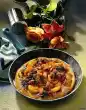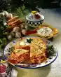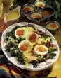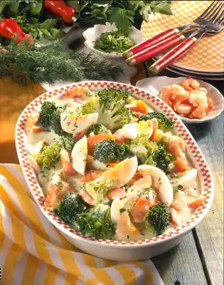 Heat the fat. Sweat flour in it. Deglaze with milk, cream and stock and let simmer for about 5 minutes while stirring. Quench eggs cold, peel and cut into six. Warm up eggs, vegetables, herbs and prawns in the sauce. Season to taste with salt and pepper