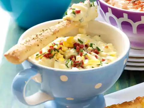 Mix mayonnaise, milk and yoghurt. Season with salt, pepper and 1 pinch of sugar. Wash the chives and chop finely. Chop the eggs. Mix everything. Season to taste.