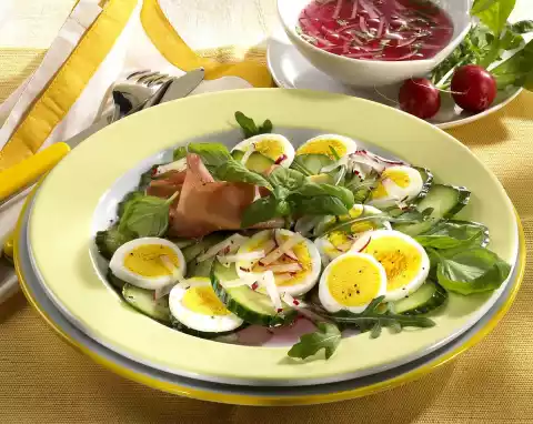 Boil eggs for 8-10 minutes until hard. Then rinse cold, peel and slice. Wash cucumbers and cut into fine slices. Wash rocket, pluck a little smaller. Pluck basil leaves from the stems.