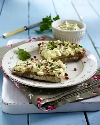 spread the egg mixture on the slices of bread, arrange on plates and sprinkle with parsley and diced ham