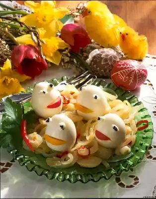 Season salad with salt and pepper and let it cool down. Cut the bottom of the eggs slightly diagonally (so that they stand upright). Cut a notch in the lower half of the eggs and insert a lemon wedge or a radish wedge as a mouth as desired. For the eyes, put some mayonnaise on the upper half of the eggs and garnish with some caviar. Arrange onion salad and egg frogs on a plate and serve garnished with parsley and chilli pepper