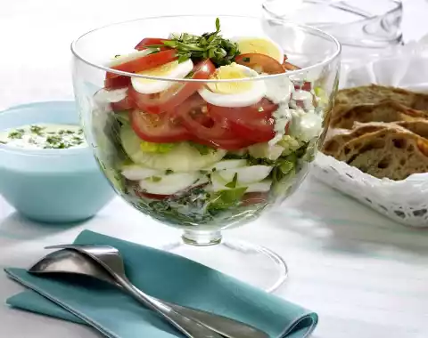 Mix remaining herbs with spring onions, set aside approx. 2 tablespoons. Place lettuce, tomatoes, eggs, leek onion and herb mixture, pineapple alternately in a glass bowl, drizzle with dressing in between.