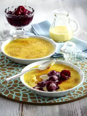 Sprinkle each cream evenly with 1 tablespoon of sugar. Caramelise with a gas burner or under the grill step of the oven. Serve crème brûlée immediately. Add the raspberry compote. Sprinkle with 1 tablespoon of eggnog as desired