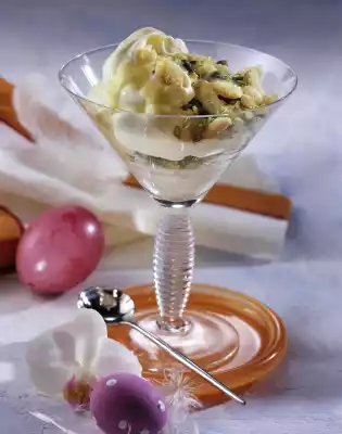 Coarsely crumble the lady fingers. Coarsely chop the pistachios. Mix both. Layer alternately with the quark cream in 4 dessert glasses. Drizzle the rest of the egg liqueur over them