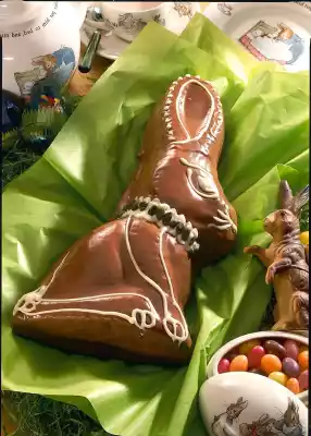 Pour in the dough and bake in the preheated oven (electric: 175 °C/ gas: level 2) for about 1 1/2 hours. Let it rest for a short time, turn it over and let it cool down completely. Melt the chocolate coating separately. Cover the rabbits completely with the whole milk chocolate coating.