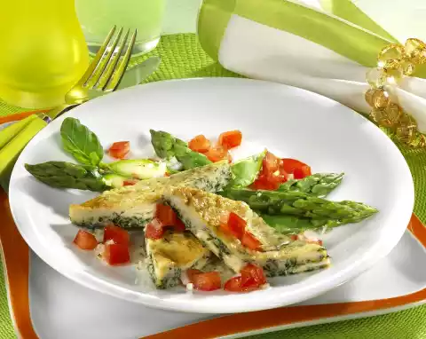 Cut the tomatoes into small cubes. Peel and chop the onion. Mix vinegar and oil. Fold in onion. Season with salt, pepper and sugar. Mix asparagus, diced tomatoes and the marinade. Cut the omelette into rhombs and arrange on plates with the asparagus and tomato salad. Garnish with basil
