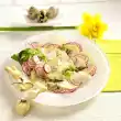 Then let it set for another 3 minutes. Cut the lower woody ends off the asparagus. Wash the asparagus and cut into small pieces. Cook in boiling salted water for 4 minutes. Remove the asparagus and let it cool down. Clean, wash and quarter the tomatoes and remove the seeds. Cut the tomatoes into small cubes. Peel and chop the onion. Mix vinegar and oil. Fold in onion. Season with salt, pepper and sugar. Mix asparagus, diced tomatoes and the marinade.