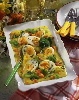 Season sauce with mustard, salt and pepper. Drain the vegetables and add to the sauce. Rinse, peel and halve the eggs. Arrange vegetables. Put eggs on top. Serve sprinkled with chopped parsley