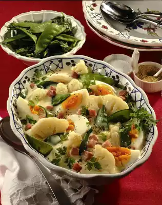 Cut the ham into cubes. Drain the eggs and chill in cold water. Drain the vegetables and collect the cooking water. Heat the fat in a saucepan. Add flour and sauté. Deglaze with 1/2 litre vegetable water and cream and mix well. Season sauce with mustard, salt and pepper. Let it swell for about 10 minutes at low heat. Peel and halve the eggs.