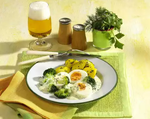 Drain the broccoli. Halve the eggs. Carefully fold the herbs, eggs and broccoli into the sauce. Warm them up again. Arrange egg ragout on plates and garnish with dill. Boiled potatoes taste good with it.