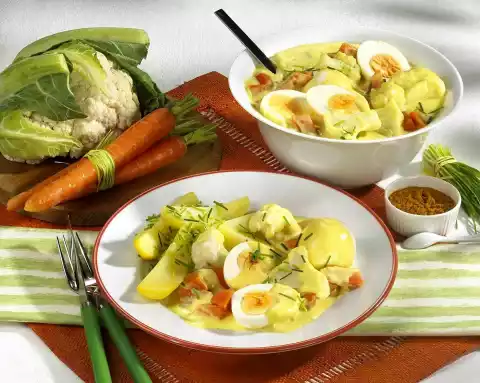 Peel, wash and slice the potatoes. Cook potatoes in boiling salted water for about 15 minutes. Peel onion and garlic and chop finely. Drain cauliflower and carrots and let them drain.
