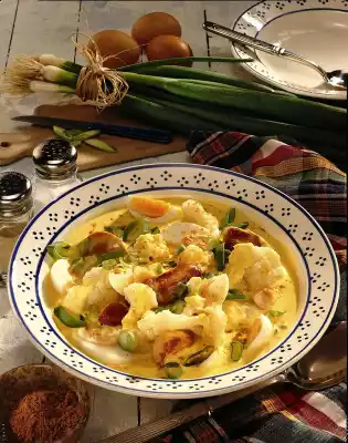 Melt fat in it, stir in flour and curry and sweat briefly. Add 1/2 litre cauliflower water and cream while stirring. Let it swell for about 10 minutes at low heat. Season to taste with salt and pepper. Cut eggs into quarters. Add eggs, cauliflower and meat to the sauce. Heat up briefly. Sprinkle with spring onion green